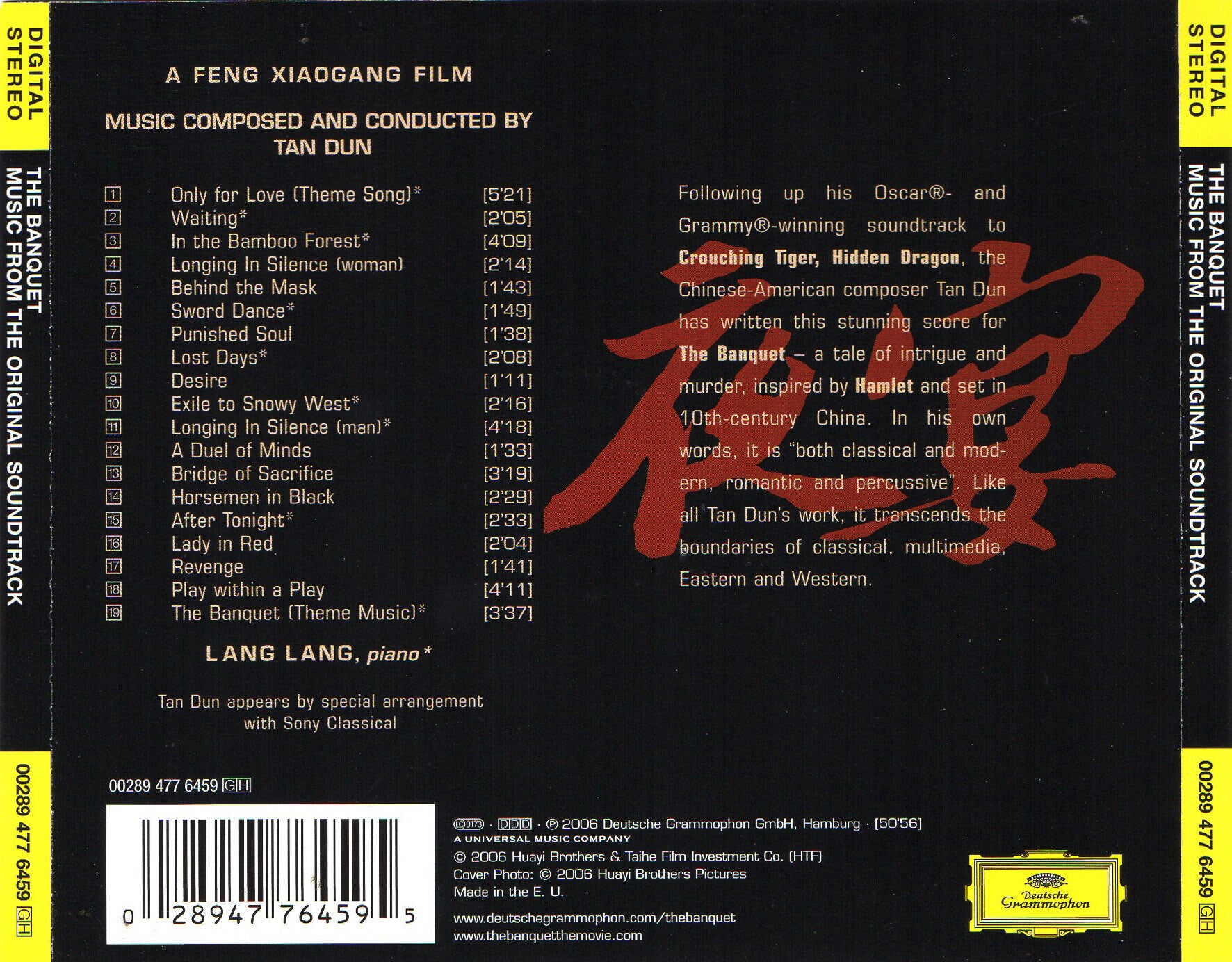 Artikel:The Banquet soundtrack CDLabel: Deutsche GrammophonJaar: 2006Info:zie scan voor tracklistLang Lang/Tan DunStaat:****