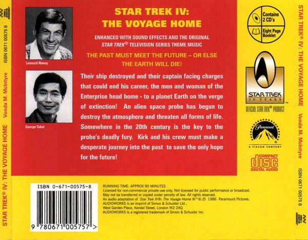 Artikel:Star Trek IV audiobook 2CDMaatschappij:Paramount/Simon & Schuster AudioworksJaar:1986Land:USAEAN:9780671005757Info:ingesproken door Leonard Nimoy en George TakeiStaat:***1/2