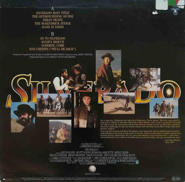 Artikel: Silverado soundtrack LP Maatschappij:Geffen RecordsJaar:1985Info:Bibliotheek stickers op bovenkant hoes en op label + ”afgeschreven” stempeltjesComponist:Bruce BroughtonStaat:Hoes:***stickers/kl beschadiging bovenkantPlaat:****