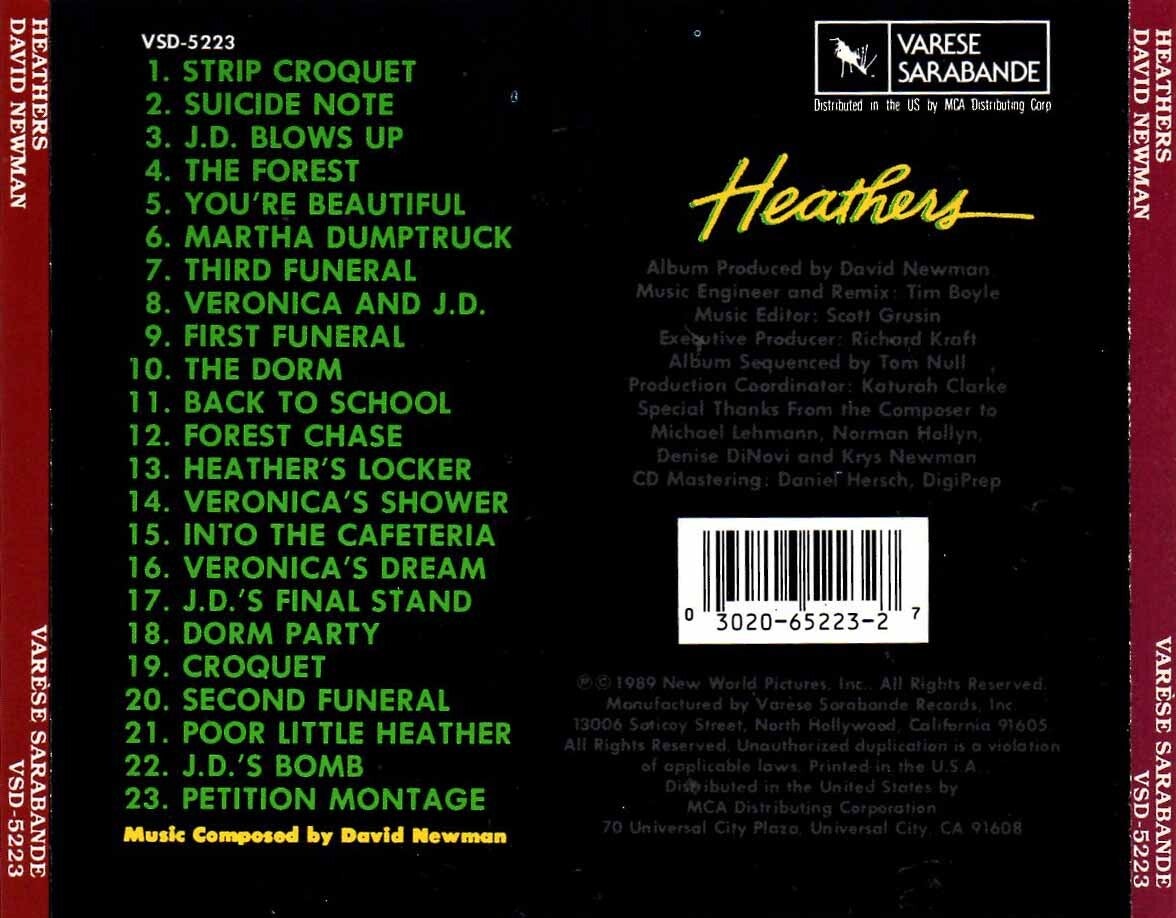Artikel:Heathers soundtrack CD Maatschappij:Varese Sarabande Jaar:1989EAN:3020652337Componist:David NewmanInfo:zie scan voor tracklistStaat:****zijkant licht verkleurd