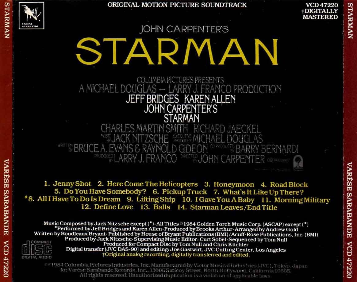 Artikel:Starman soundtrack CD Maatschappij:Varese SarabandeJaar:1984EAN:/Componist:Jack NitzscheInfo:zie scan voor tracklistStaat:****Case dent links onderin booklet