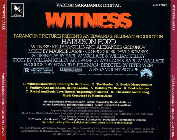 Artikel:Witness soundtrack CD Maatschappij:Varese SarabandeJaar:1985Componist:Maurice JarreInfo:zie scan voor tracklistStaat:***1/2booklet heeft 'case dent' aan zijkant