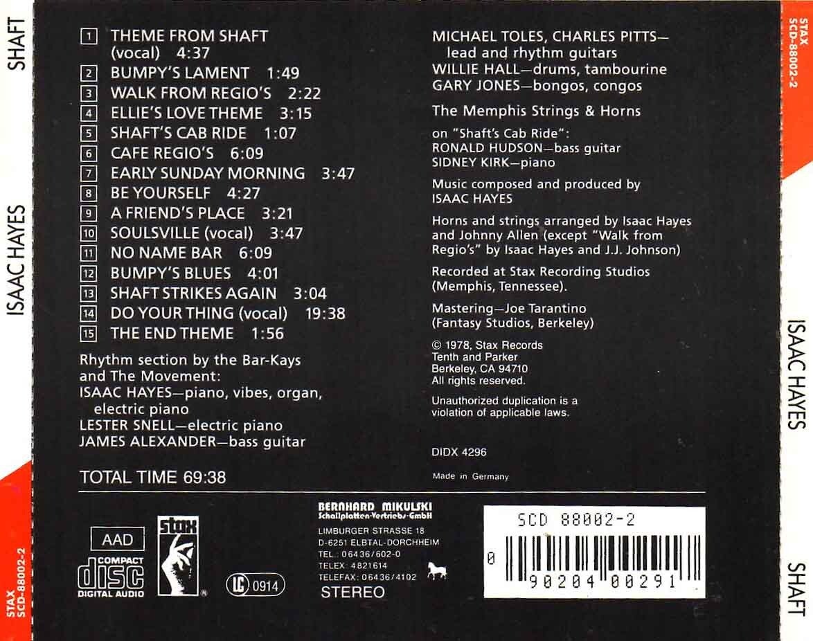 Artikel:Shaft soundtrack CD Maatschappij:StaxJaar:1978EAN:9020400291Componist:Isaac HayesInfo:zie scan voor tracklistStaat:****