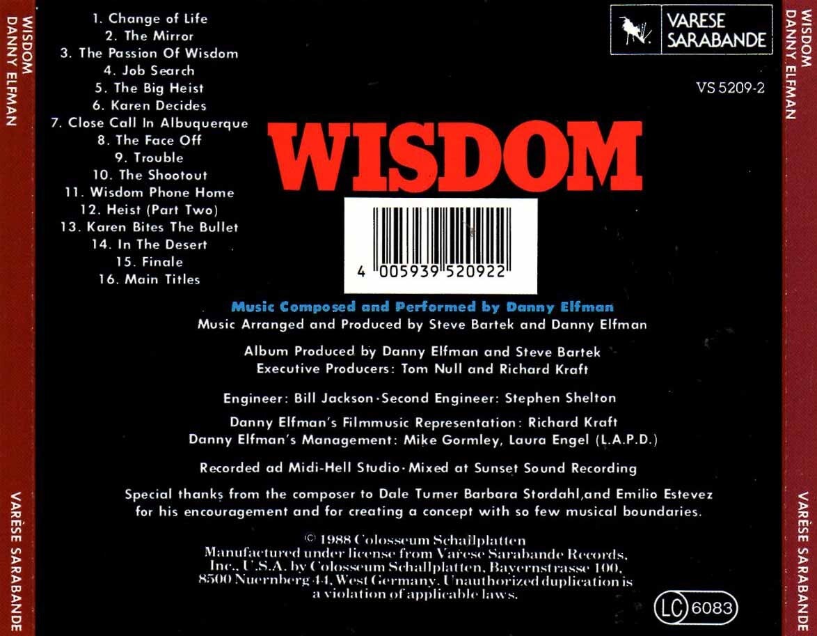 Artikel:Wisdom soundtrack CD Maatschappij:Varese SarabandeJaar:1988EAN:4005939520922Componist:Danny ElfmanInfo:zie scan voor tracklistStaat:****