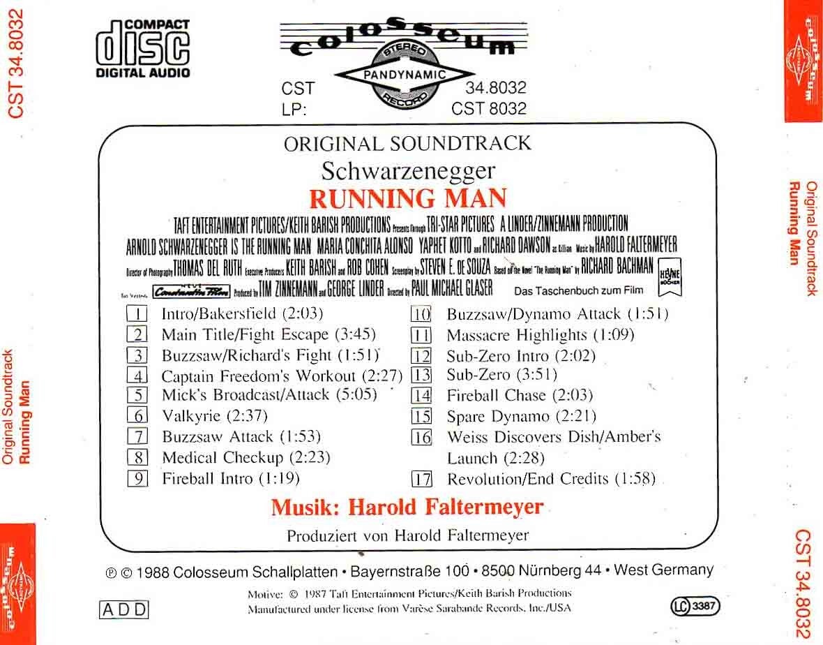 Artikel:Running Man soundtrack CD Maatschappij:ColosseumJaar:1988EAN:/Componist:Harold FaltermeyerInfo:zie scan voor tracklistStaat:****