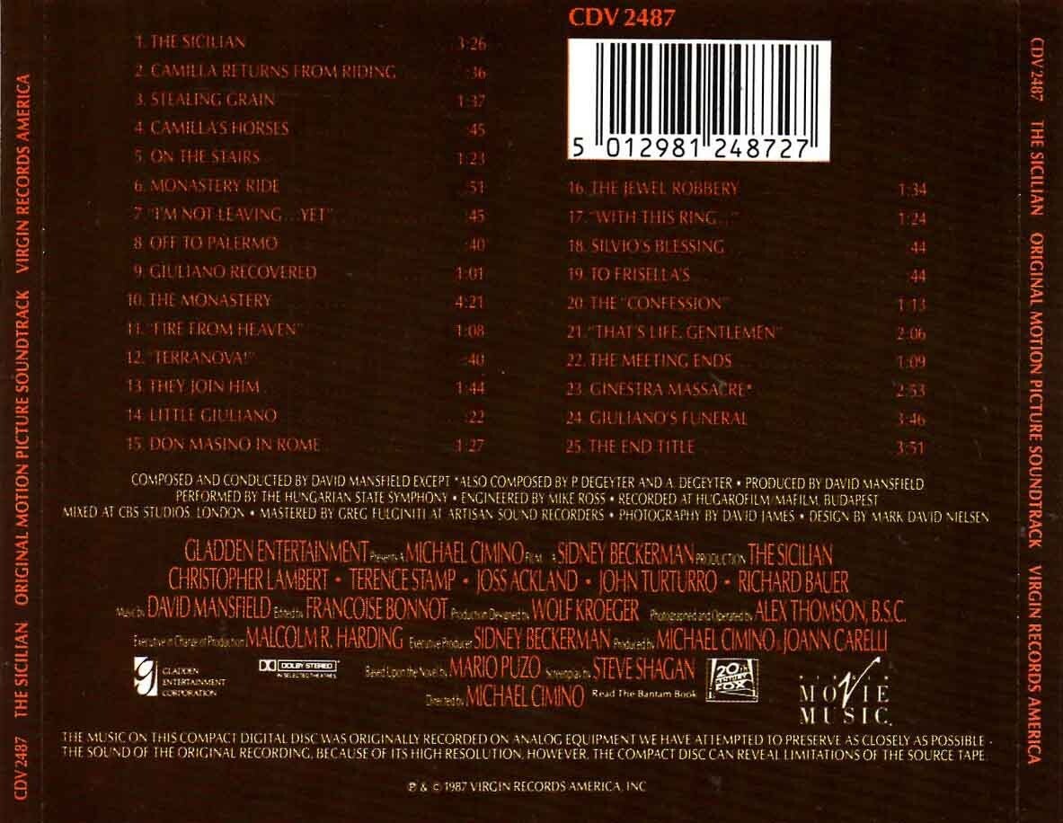 Artikel:Sicilian, the soundtrack CDMaatschappij:VirginJaar:1987EAN:5012981248727Componist:David MansfieldInfo:zie scan voor tracklistStaat:****booklet heeft lichte 'case dent'