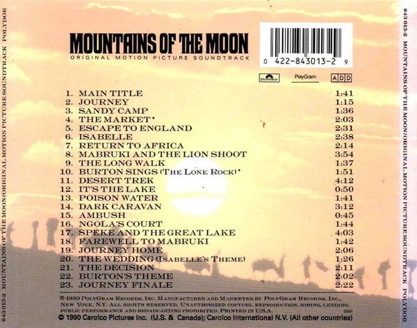Artikel:Mountains of the moon soundtrack CD Maatschappij:PolydorJaar:1990EAN:042284301329Componist:Michael SmallInfo:zie scan voor tracklistStaat:****