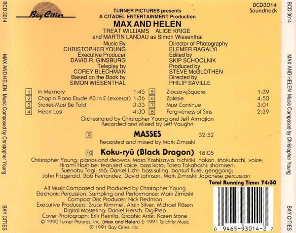 Artikel:Max and Helen soundtrack CD Maatschappij:Bay CitiesJaar:1991EAN:09465901427Componist:Christopher YoungInfo:zie scan voor tracklistStaat:****zijkant licht verkleurd (zie scan)